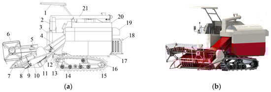 The 4LZ-4.0 flax combine structure schematic and prototype diagram: (a) Schematic diagram of the structure; (b) prototype drawing. (1) Awning. (2) Operating lever. (3) Driver’s platform. (4) Over-bridge. (5) Wheel spreader. (6) Wheel paddle. (7) Splitter. (8) Blade guard. (9) Cutting knife. (10) Guard. (11) Header. (12) Hydraulic cylinder. (13) Driving wheel. (14) Support wheel. (15) Track. (16) Tensioning wheel. (17) Chassis. (18) Oil tank. (19) Shredder. (20) Threshing drum. (21) Grain discharge cylinder.