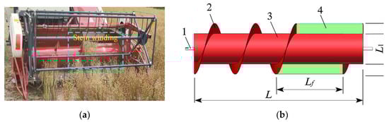 When the flax is harvested, the header is responsible for cutting the linseed stalks and then transporting the linseed stalks to the spiral conveyor. The linen stalks are in an upright state when the cutting is cut. For delivery the stalks are wrapped around the transportation dragon, causing the flax of the stalks to be blocked, and the subsequent work cannot be performed. Therefore, this study is carried out to improve the structure of the conveying churn’s feeding section by adding two 100 mm high anti-winding plates to the feeding section, which is designed to be movable and adjustable using bolts (Figure 3). The churn length is L = 1610 mm without the anti-wrap plate, the diameter is L1 = 300 mm, and the churn perimeter is C1 = 942.48 mm. The number of telescopic teeth in the feeding section was reduced to reduce the hanging phenomenon, while the number of telescopic teeth in other positions remained unchanged []. The churn is designed for a speed of 216 r·min−1 to avoid cutting table vibration and grain loss caused by churn rotation, and the spiral blades of the churn are fabricated of stainless steel with a thickness of 3 mm. The flax harvester is designed for an engine speed of 2400 r·min−1, an advancing speed of 1 m·s−1, a paddle wheel speed of 40 r·min−1, a cutting deck churn speed of 216 r·min−1, a threshing drum speed of 694–833 r·min−1, a centrifugal fan speed of 894 r·min−1, and a vibrating screen shaft speed of 477 r·min−1 when operating.
