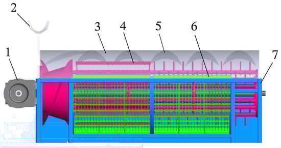 The performance of the cleaning device, as a key component of the combine, has a direct impact on harvesting efficiency []. Flax seeds and glumes in flax off-cuts do not differ significantly in terms of suspension rate and mixing, and it is difficult to separate them using a single cleaning system. The cleaning unit in this study consists of a centrifugal fan double-decker reciprocating vibrating screen with a primary seed spiral conveyor and a secondary trash spiral conveyor below the cleaning unit (Figure 8). The centrifugal fan, powered by the engine, is responsible for blowing out the light debris and glumes produced by threshing; the vibrating screen, powered by the eccentric wheel in a reciprocating motion, is responsible for sieving short stalks, unthreshed cobs, and flaxseed grains []. In the clearing process of flax-stripped material, the clearing device is set according to the physical characteristics of the stripped and aerodynamic differences to complete the clearing operation. Due to the physical characteristics of the components being closer, and small differences in suspension speed, it is easy to mix and easy to produce clearing losses. To reduce the rate of impurities and loss of flax seeds, a double-decker reciprocating vibrating sieve using a fish scale sieve is used to separate the material in the unpurified ears and long stalks, etc., the lower sieve used a woven sieve, the purpose is to separate the impurities of the flax seeds, the unpurified ears, into the threshing drum for refreshing operations.