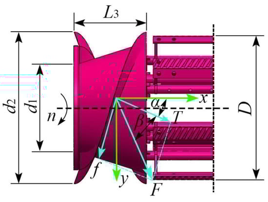 Force analysis of screw feed head and flax stem: Note: f is the frictional force between the flax plant and the spiral blade, N; T is the normal thrust, N; F is the combined frictional and thrust force, N; ω is the angular speed of the threshing drum in rad·s−1; D is the diameter of the threshing drum in mm; d1 is the diameter of the small end of the spiral feeding head in mm; d2 is the diameter of the large end of the spiral feeding head in mm; L3 is the length of the spiral feeding head in mm; β is the angle of friction between the threshing material and the spiral blade, (°); α is the angle of lift of the spiral blade, (°).
