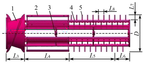 Schematic diagrams of the combined longitudinal axial flow threshing drum with ribs-rod teeth: (1) Screw feed head. (2) Striker threshing element. (3) Spoke disc. (4) Crossbar. (5) Rod tooth threshing element. Note: L4 is the length of the striker section in mm; L5 is the length of the separating section in mm; L6 is the length of the grass discharge section in mm; L7 is the working length of the rod teeth in mm; L8 is the distance between the rod teeth in mm.