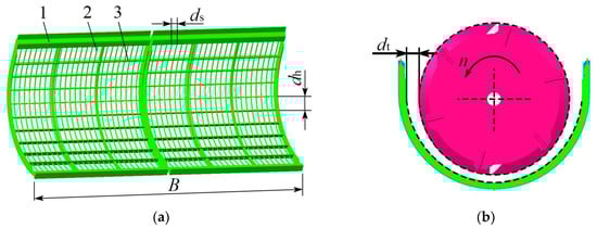 Schematic diagram of the structure of the narrow grid recess: (a) Concave plate size. (b) Concave plate-clad corners. (1) Narrow grating concave sieve. (2) Grating bars. (3) Horizontal spacer. Note: ds is the spacing between the grating bars in mm; dh is the spacing between the horizontal dividers in mm; dt is the gap between the concave plates in mm.