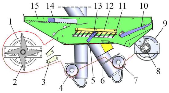 Schematic diagrams of the structure of the combined cleaning unit: (1) Centrifugal wind machine power input belt. (2) Centrifugal divider. (3) Wind guide. (4) Primary seed screw conveyor. (5) Woven sieve. (6) Seed skid. (7) Secondary miscellaneous residual screw conveyor. (8) Eccentric bearing. (9) Vibrating screen power input pulley. (10) Tail sieve. (11) Fish scale sieve. (12) Fish scale sieve fixed plate. (13) Fish scale sieve opening adjustment device. (14) Shaking plate. (15) Vibrating screen housing.
