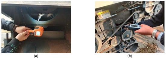 Determination of threshing drum speed and centrifugal fan airspeed on the prototype: (a) Threshing drum speed determination. (b) Centrifugal fan outlet air velocity determination.