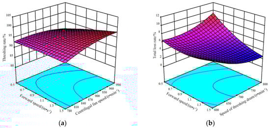 According to the quadratic regression model of each response value obtained from the experiment, the response surface plots of different interaction levels of three factors, namely advancing speed, threshing drum speed, and centrifugal fan speed, were made on the rate of threshing and total loss, and the response surface between each factor was made by the regression model Equations (19) and (20), respectively (Figure 13).