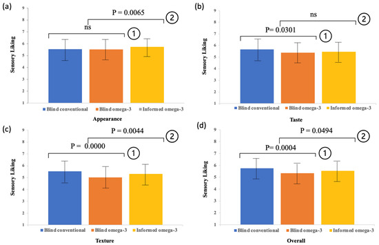 Mean ratings of (a) appearance, (b) taste, (c) texture and (d) overall liking are shown. Error bars represent standard deviation of the mean. ① = liking of conventional vs. omega-3 samples in the blind condition (paired Student’s t-test); ② = liking before vs. after the information disclosure of omega-3 samples (paired Student’s t-test).