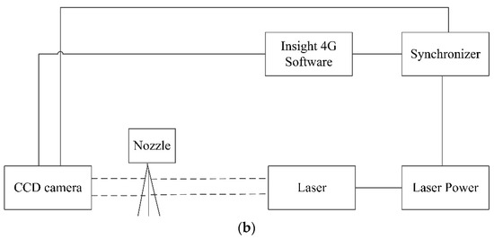 The 2D PIV system (Figure 1b) produced by TSI Incorporated containing a PowerView Plus 4MP-HS CCD camera (model 630091), a Nd: YAG Nano laser, a synchronizer (model 610036), and image analysis software (Insight 4G) was used to measure the characteristics of the spray sheet and droplets close to the nozzle. The camera could capture 2048 × 2048 pixels and was mounted parallel to the liquid sheet surface. The AF-S VR lens (Nikon, Japan) with fixed aperture of F/22 was used in this test. The laser had two independent green lights operating at a maximum rate of 15 Hz, which emitted lights at 7.5 Hz in this test. The laser’s exposure time was 5000 µs, and the camera exposure time was automatically adjusted according to the laser exposure and the laser pulse interval time. The CCD camera and Insight 4G software were connected by a synchronizer (a crucial part of the frame-straddling technique). The laser emitted a short pulse of light at the end of one camera frame and another at the beginning of the next frame. The time interval between the laser pulses was 30 µs according to the velocity of the liquid sheet and the calculation limit of the instrument.