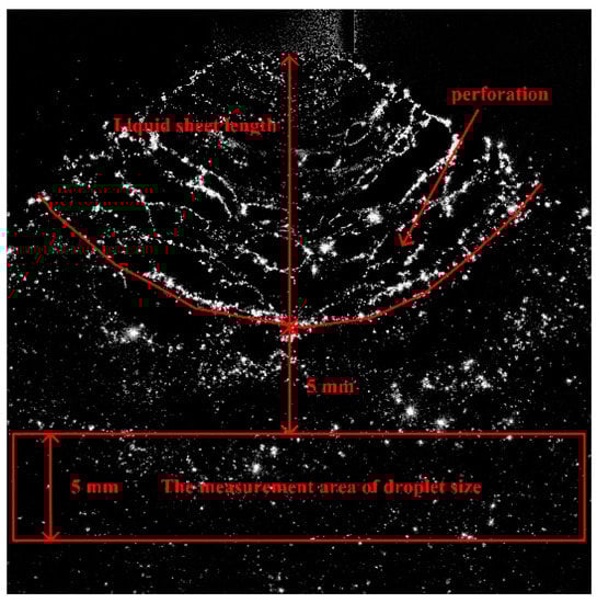 To ensure the adequate breakup of the liquid sheet and obtain the information of initial droplets for the description of a wide variety of flow conditions, the droplet group in the spray belt with a thickness of 5 mm was intercepted from 5 mm below the breaking point of the liquid sheet (Figure 3), which was measured using Insight 4G software. The irregular droplet diameter was corrected by Equation (2). The shortest and longest lengths of the irregular droplets corresponded to and , respectively.
