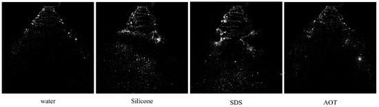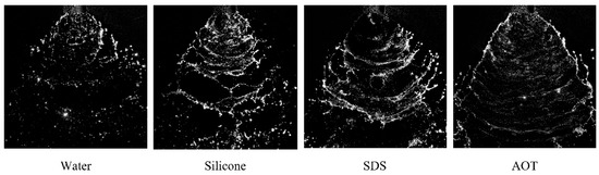 For the TXVK hollow cone nozzle, the mechanism of liquid sheet breakup was completely different from that of XR nozzle due to the difference in nozzle structure. Since the liquid was sprayed into the still air and then an internal suction flow was formed in the inner cavity of formed liquid sheet, it can be observed from Figure 6 that there were also droplets inside the liquid sheet cavity. The effects of the silicone and SDS spray solutions delayed the breakup of the liquid sheet (and thus the resulting droplet size distribution). The morphology and breakup distribution of the liquid sheet with the AOT solution was similar to that of water.