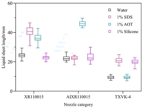 ANOVA analysis was also employed for the liquid sheet length under different conditions. Water alone resulted in the shortest liquid sheet length, except for spraying the silicone solution with the XR nozzle and spraying the SDS solution with the AIXR nozzle. The liquid sheet lengths of the SDS (40.48 mm) and AOT (36.36 mm) solutions were significantly longer than that of water alone (24.49 mm) at p < 0.001 for the XR nozzle, while the silicone (22.75 mm) solution was significantly lower than that of water alone at p = 0.020. For the AIXR nozzle, the liquid length of the AOT solution was significantly higher than that of water at p < 0.001. The average liquid sheet length of AOT (46.09 mm) solution was approximately two times higher than those of 1% SDS (22.21 mm), silicone (23.33 mm), and water (22.39 mm). For the TXVK nozzle, the high value (p = 0.797) of the AOT solution implied that there was no significant difference between the means of liquid sheet length for AOT and water, while the opposite results were obtained for the SDS and silicone solutions (p < 0.001). The breakup of the liquid sheet can lead to the generation of a large number of droplets. The droplet size, as an important attribute of droplets, may be affected by adjuvants and nozzle types.