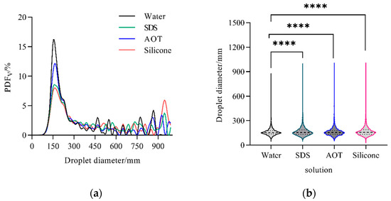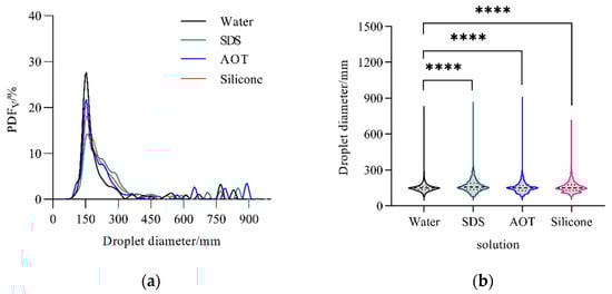 (a) Curve of probability volume density function (PDFV). (b) Violin plot of drop size for the AIXR nozzle with different solutions. “****” indicates significance at p ≤ 0.0001.