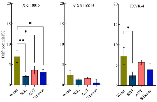 Drift potential percentages from polytetrafluoroethylene lines at the 2 m downwind position. “*” and “**” indicates significance at p ≤ 0.05 and p ≤ 0.01, respectively.