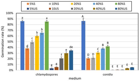 Germination rates of conidia and chlamydospores of Trichoderma longibrachiatum Tr58 in sterilized and unsterilized soils with different moisture levels. Lowercase letters and uppercase letters respectively indicate the significant differences of germination rates of chlamydospores and conidia in different mediums, the same letter above the column indicates no significant difference at p < 0.05. CK: PDA medium; US: unsterilized soil; S: sterilized soil, 5%, 10%, 20%, 40%, 80%: soil moistures.