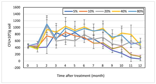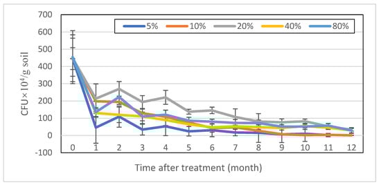 Conidia of T. longibrachiatum Tr58 (about 4.5 × 106 CFU/g soil) were added to soils with moisture contents of 5, 10, 20, 40, and 80%, respectively, and the well-mixed soils were then buried underground in a natural environment for 12 months. The Tr58 content in soil was detected every month and denoted by CFUs per gram of soil. The results are shown in Figure 2. The Tr58 content in all soil samples decreased continuously over time, among which the Tr58 content in soil with a 5% moisture content decreased the most and the most quickly. The Tr58 content in 20% moisture content soil was the highest, which showed that this moisture content was relatively conducive to the survival of Tr58 and enabled disease control. In the 12th month, the Tr58 content was 0.16, 0.16, 7.38, 6.48, and 6.36% of the initial application in soils with 5, 10, 20, 40, and 80% moisture content, respectively. A dry environment was not conducive to the long-term survival of Tr58.