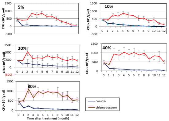 Approximately 4.5 × 106 CFU/g of Tr58 conidia and chlamydospores were mixed well in the soils with different moisture contents, and the dynamic changes of Tr58 contents were compared over 12 months (Figure 4). The Tr58 content in the conidia-amended soils was at a low level and continued to decrease. As for chlamydospore-amended soils, the Tr58 content showed a dynamic process of first increasing in the 2nd month and then decreasing slowly; these values were much higher than those in conidia-added soils. The average Tr58 content in chlamydospore-amended soils with 5, 10, 20, 40, and 80% moisture content was 19.2 times that of conidia-amended soils at 12 months. The results indicated that chlamydospores were more tolerant than conidia, especially in a relatively dry soil environment; therefore, they have high potential for disease control.