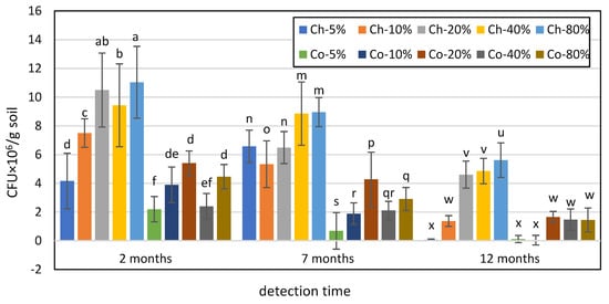 Trichoderma longibrachiatum Tr58 contents in conidia- and chlamydospore-amended soils with different moisture contents in a natural environment. Lowercase letters a–f, m–r, and u–x respectively indicate the significant difference of Tr58 contents in different moisture soils amended chlamydospores and conidia-mended soils at 2, 7, and 12 months later, and the same letter above the column indicates no significant difference at p < 0.05. Ch: chlamydospore; Co: conidia; 5%, 10%, 20%, 40%, 80%: soil moistures.
