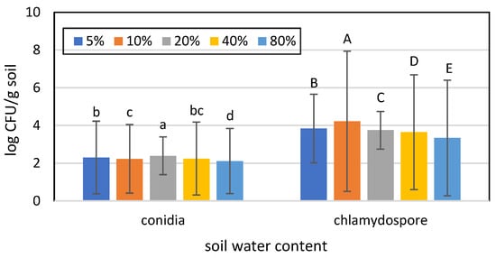 Conidia and chlamydospores of Tr58 were added to soils with 5, 10, 20, 40, and 80% moisture content and kept in a natural environment for 24 months. The Tr58 content in soils is shown in Figure 6 and expressed as the log value of CFU/g soil. The Tr58 content in conidia-amended soils was 130–250 CFU/g, which was close to those in the natural soil (data not shown), indicating that the increase in Tr58 content in soils due to additional conidia was close to zero, 24 months later. In chlamydospore-amended soils, the Tr58 content exceeded 1000 CFU/g soil, which was significantly higher than that of conidia. The Tr58 content was 1.95 ± 0.44 × 104 CFU/g soil with 20% moisture content, which was about 2.2% of the initial Tr5 content (4.5 × 106 CFU/g) and 114 times that of conidia in soils with the same moisture content. However, for 80% moisture content, the Tr58 content in soil was 1750 ± 677 CFU/g soil 24 months later, which was only 0.0038% of the initial content of Tr58. Chlamydospores were more suitable for long-term survival in soil than conidia, and a low soil moisture content such as 10% was conducive to the long-term survival of chlamydospores.
