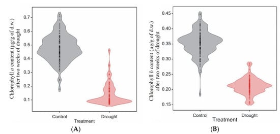 (A) The density plot of chlorophyll a content (µg/g of d.w.) after two weeks of drought for treatments. (B) The density plot of chlorophyll b content (µg/g of d.w.) after two weeks of drought for treatments.