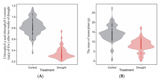 (A) The density plot of chlorophyll a and chlorophyll b content (µg/g of d.w.) after two weeks of drought for treatments. (B) The density plot of the mass of stems/plant (g) for treatments.