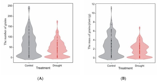 (A) The density plot of the number of grains for treatments. (B) The density plot of the mass of grains/plant (g) for treatments.
