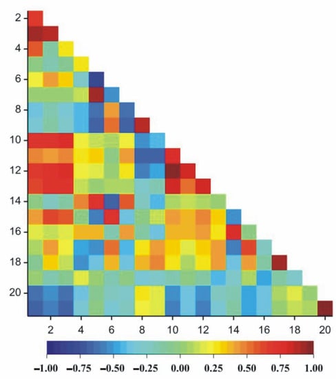 A heatmap showing correlation coefficients between all pairs of observed traits in drought treatment. [1—chlorophyll a content (µg/g of d.w.) on the first day of drought; 2—chlorophyll b content (µg/g of d.w.) on the first day of drought; 3—chlorophyll a and chlorophyll b content (µg/g of d.w.) on the first day of drought; 4—carotenoid content (µg/g of d.w.) on the first day of drought; 5 —Fv/Fm (maximum photochemical efficiency of PS II) on the first day of drought; 6—area (pool size of electron acceptors from PSII) on the first day of drought; 7—PI (overall performance index of PSII photochemistry) on the first day of drought; 8—ETo/CS (energy used for electron transport) on the first day of drought; 9—RC/CSo (the number of active reaction centers in the state of the fully oxidized PSII reaction center) on the first day of drought; 10—chlorophyll a content (µg/g of d.w.) after two weeks of drought; 11—chlorophyll b content (µg/g of d.w.) after two weeks of drought; 12—chlorophyll a and chlorophyll b content (µg/g of d.w.) after two weeks of drought; 13—carotenoid content (µg/g of d.w.) after two weeks of drought; 14—Fv/Fm (maximum photochemical efficiency of PS II) after two weeks of drought; 15—area (pool size of electron acceptors from PSII) after two weeks of drought; 16—PI (overall performance index of PSII photochemistry) after two weeks of drought; 17—ETo/CS (energy used for electron transport) after two weeks of drought; 18—RC/CSo (the number of active reaction centers in the state of the fully oxidized PSII reaction center) after two weeks of drought; 19—the mass of stems/plant (g); 20—the number of grains; 21—the mass of grains/plant (g)].