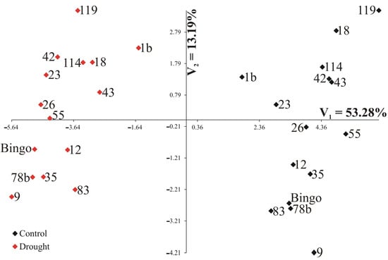 Distribution of 15 genotypes in the space of the first two canonical variables for both treatments: control and drought.