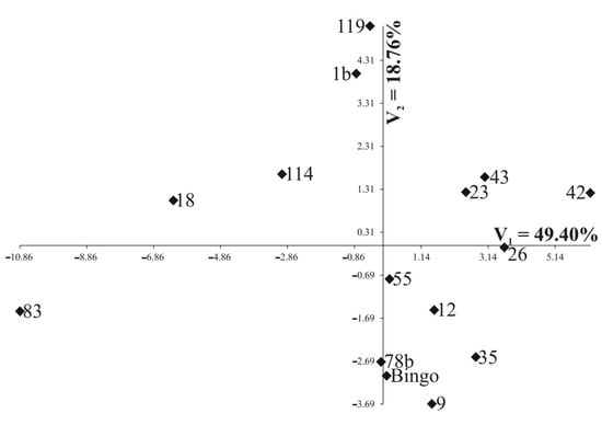 Distribution of 15 genotypes in the space of the first two canonical variables for drought.