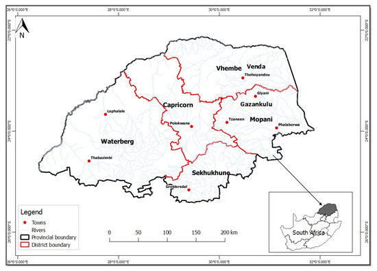 Annual rainfall in the selected districts is between 300 mm and 400 mm [12,31]. The final stage involved selecting the population who participated in this study, comprised SHF residing in the two districts. This study used random sampling to select 100 SHF who covered different agro-ecological zones [40]. Fifty participants (10 within each local municipality) were targeted from each district. The list of SHF who met the relevance criteria was provided by the respective local offices of the Limpopo Department of Agriculture and Rural Development (LDARD) in each local district. The sampling technique was used to assess uniformity and homogeneous characteristics and meet the study’s objectives while adhering to the statistical specifications for accuracy and representatively.