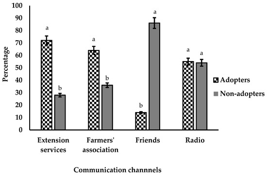 Findings revealed that 64% of adopters and 36% of non-adopters resorted to farmer associations to receive information on agricultural technologies. This implies that most adopters in the study area belonged to a farmers’ association, which not only enables them to share information during informal open discussions at agricultural fairs, with workshops organized by farmers and associations, but also to enjoy the benefits accrued to co-operative societies through a pooling of resources for a better expansion and effective management of resources and farms [58,59]. In contrast, other sources of information included friends, which were used by 14% of adopters and 86% of non-adopters. A large percentage of adopters’ dependence on such interpersonal communication results from the fact that it assists in breaking the barrier of formal relationships, generating warmth, and creating harmony necessary for socio-economic development [60].