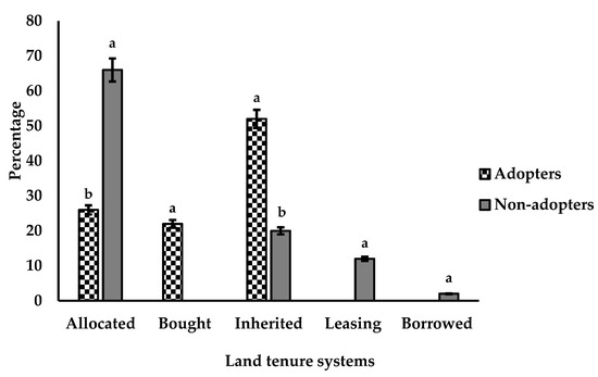 The land tenure system has also been identified as one of the most critical factors hindering SHF adoption of CSIT. To understand why most participants had no access to credit and the low adoption rate of CSIT, it was necessary to examine the land tenure arrangements of the study areas. As indicated in Figure 3 the study found that 26% of adopters acquired land through allocation by the chief, 22% bought the land, and 52% inherited the land. These findings show that most SHF had access to land through inheritance under a secure land tenure system, which increases the likelihood of adopting CSIT. This is because land tenure security enables SHF to use agricultural land as collateral for larger loans to cover increased fixed and variable production costs associated with adopting new technology [44]. Thus, reducing some level of risk and uncertainty for the SHF, especially the extent to which farmers are prepared to invest in improvements in production, sustainable management, and adoption of new technologies and promising innovations [44,72].