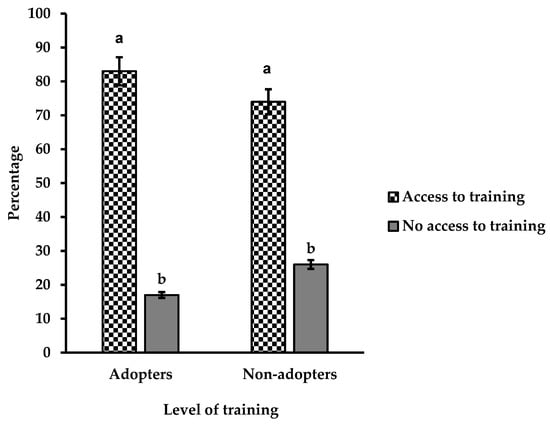 Agricultural training is another effective channel in which farmers are equipped with the information and technical know-how required to adopt relevant technologies [79,80]. From the survey, it has been found that 83% of the adopters and 74% of the non-adopters had undergone training (Figure 4). However, access to training does not necessarily mean that the SHF will adopt the technology because the number of times the farmer has been trained in technology significantly influences agricultural innovation adoption [53]. In some cases, extension agents who are often responsible for carrying out the training are in a position of knowledge and experience similar to that of farmers in CSIT, such as micro-irrigation [81].