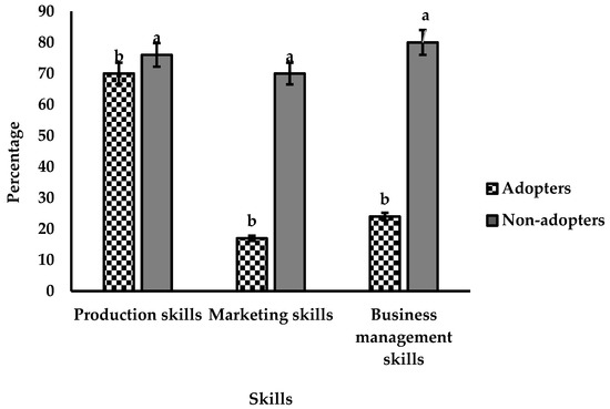 Despite the attendance of these different agricultural programmes, it has been revealed that some of the participants’ training programmes were not intensive enough to improve their agricultural skills and knowledge. This resulted in the study assessing the competence of participants in a range of farming skills: production, marketing, and business management. Figure 5 shows that 70% of adopters and 76% of non-adopters said they still need more training in climate-smart crop production techniques such as irrigation frequency and scheduling, determining intra- and inter-row spacing, applying eco-friendly herbicides and fungicides, and fertilizer application. These techniques are crucial because improper use of them could harm yield, the environment and, consequently, the livelihood of nearby people. Such training requires interpersonal channels, such as on-farm demonstrations, which enhance interaction and feedback between a source and receiver [82]. For instance, du Plessis et al. [79] mentioned that demonstrations play an essential role in assisting farmers in avoiding damage to the components of the drip system, such as puncturing of pipe and, in cases where the laterals need to be moved from time to time, farmers need to be trained on how to execute this task in a way that prevents dirt from entering the components. Although both groups have been recorded to face marketing challenges, there seems to be no training provided in this regard among the non-adopters, as 70% compared to the 17% of the adopters indicated that to obtain a return on their investment, it is essential to be trained in marketing skills such as price determination, knowledge of the market for produce and packaging required for marketing their product. According to Plantinga [83], the relationship between market access and technology adoption can work both ways. Firstly, to increase SHF participation in markets, they need to increase their production by adopting new agricultural technologies such as CSIT. Due to this, a farmer’s income and motivation to produce may improve when they have better access to markets with better prices [82]. In contrast, 80% of adopters and 24% of non-adopters noted that training in the proper application of business skills, such as financial management, would help them to be managers of their finances and support themselves in adopting CSIT.