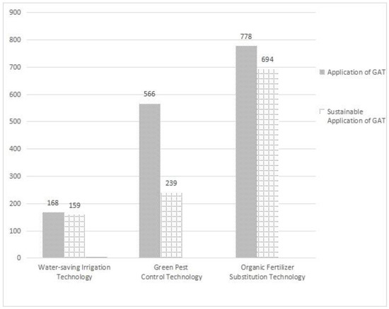 China is one of the most populous countries in the world, and agriculture has played a prominent role in the country’s remarkable economic achievements [1,2]. However, the accelerated development of agriculture has caused the energy demand to rise and has produced severe environmental pollution as well, which has threatened the food security and ecological security of the country [3,4,5]. Excessive and improper use of fertilizers, pesticides and irrigation water in agricultural production has caused serious pollution of agricultural land, water resources and the air environment and agricultural product safety accidents. Therefore, China’s agriculture needs to step into a new stage of accelerating transformation and upgrading to achieve green development [6]. Green agricultural technology (GAT) can conserve water, improve the soil structure, increase soil organic matter and enhance farmland productivity. It is a principal part of promoting sustainable agricultural development, ensuring consumer food safety and protecting rural ecological environments. The popularization of GAT has become the inevitable course to promote the green development of agriculture [7,8]. The United Nations Environment Program classifies GAT in broad strokes; it mainly includes aquatic ecological protection and restoration technology, fertilizer and pesticide application reduction and efficiency improvement technology, agricultural waste recycling technology, heavy metal pollution control and treatment technology, and green and efficient production technology for supporting grass and livestock [9].