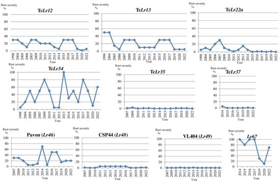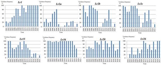 - Gultyaeva, E.; Shaydayuk, E.; Gannibal, P. Leaf Rust Resistance Genes in Wheat Cultivars Registered in Russia and Their Influence on Adaptation Processes in Pathogen Populations. Agriculture 2021, 11, 319. [Google Scholar] [CrossRef]