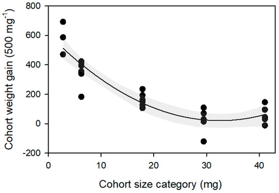 Larval survival (69 ± 7%) was lower for the smallest size category but was similar among the larger larvae (89–99%)(F4,26 = 6.342, p = 0.002). Cohort weight gains declined with increasing larval size (Figure 1; see also Table S1).