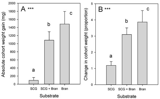 Larvae of 15 to 17 mg (dry weight) had high survival (97%) on all substrates (F2,18 = 0.415, p = 0.668: Table S1); however, absolute cohort weight gains were < 10% of the gains on SCG + bran or on bran alone (Figure 2A: F2,18 = 63.321, p < 0.001) and proportional cohort weight gains on SCG were about 30% of gains on the other substrates (Figure 2B: F2,18 = 46.867, p < 0.001).