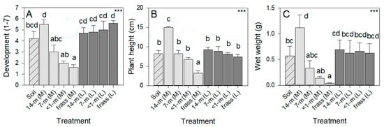 Growth of tomato seedlings in soil with SCG amendments. Results for plant development (A), plant height (B) and wet weight (C) are presented for plants grown in unamended soil (hatched bars) and soil with SCG amendments (solid bars). Amendments included 14-, 7- and <1-month-old SCG, as well as frass from BSF larvae reared on SCG. Each amendment was applied either mixed with the soil (M = light gray bars) or as a layer on top of the soil (L = dark gray bars). Results of GLMs are indicated as *** = p < 0.001. Lowercase letters indicate homogenous substrate groups (Tukey p > 0.05). Standard errors are indicated (N = 5).