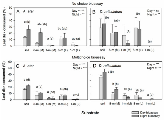 Results of no-choice (A,B) and multichoice (C,D) bioassays with A. ater (A,C) and D. reticulatum (B,D). Bioassays were conducted during daytime (light bars) and at nighttime (dark bars). Leaf disks (lettuce) were placed on substrates that included control (unamended) soil, 8-month-old SCG mixed (M) with soil or as a top layer (L) and 1-month-old SCG mixed with soil or as a top layer. Results from GLMs are presented for daytime (day) and nighttime (night) bioassays as ns = p > 0.05, ** = p < 0.01 and *** = p < 0.001 (N = 5 for no-choice, N = 6 for multichoice). Lowercase letters indicate homogenous substrate groups for daytime and nighttime (in parentheses) bioassays (Tukey, p > 0.05). Standard errors are indicated. (See also Table S2).