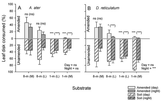 Results from binary-choice bioassays with A. ater (A) and D. reticulatum (B). Bioassays were conducted during daytime (light bars) and at nighttime (dark bars). Leaf disks (lettuce) were placed on amended and unamended soil in divided containers. The substrates included 8-month-old SCG mixed (M) with soil or as a top layer (L) and 1-month-old SCG mixed with soil or as a top layer. The percentages of leaf disks consumed over amended substrate (open bars) and unamended soil (hatched bars) are indicated. Results from GLMs based on differences between areas consumed in paired tests are presented for daytime (day) and nighttime (night) bioassays as ns = p > 0.05 and *** = p < 0.001 (N = 5). The results from paired t-tests for soil-amendment combinations are presented above the bars for daytime and nighttime (in parentheses) bioassays as ns = p > 0.05, * = p < 0.05 and *** = p < 0.001 (N = 5). Standard errors are indicated. (See also Tables S2 and S3).