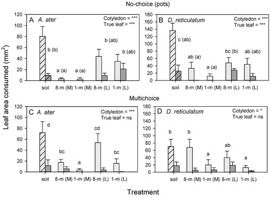 Results from no-choice bioassays with (A) A. ater and (B) D. reticulatum on radish plants in pots, and from multichoice bioassays with (C) A. ater, and (D) D. reticulatum on radish plants without soil in arenas. In the no-choice bioassays, radish plants in unamended soil (hatched bars), and soil that had 8- and 1-month-old SCG mixed (M) with soil or added as a layer (L) on top of the soil were exposed to the slugs such that the soil and plant quality affected slug behaviors. In the multichoice bioassays, corresponding plants were exposed without soil. All arenas had both cotyledon (gray bars) and true leaves (dark gray bars). The results of MANOVA are presented for areas consumed from cotyledons and true leaves as * = p < 0.05 and *** = p < 0.001. Lowercase letters indicate homogenous leaf groups, with groupings for true leaves in parentheses. Standard errors are indicated (N = 6). Plants grown in each soil type as used in the bioassay are described in Figure S1.