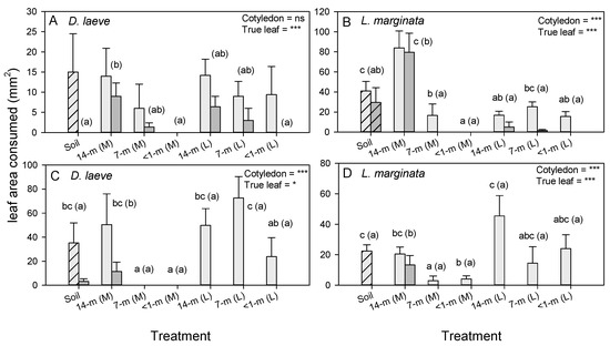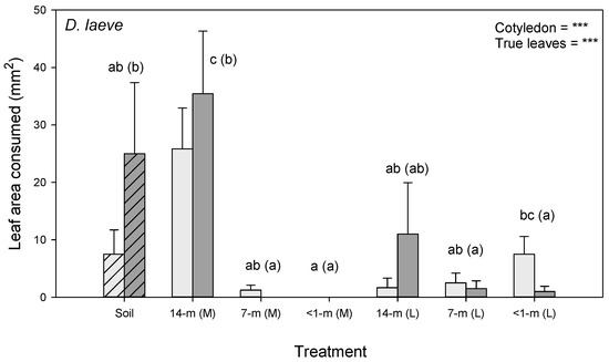 Results from a multichoice bioassay with tomato leaves exposed to D. laeve. Tomato plants were grown in unamended soil (hatched bars), and soil that had 14-, 7- and <1-month-old SCG mixed (M) with soil or added as a layer (L) on top of the soil. Cotyledons (light gray bars) and true leaves (dark gray bars) were exposed during the bioassay without soil. The results of MANOVA are presented for areas consumed from cotyledons and true leaves as *** = p < 0.001. Lowercase letters indicate homogenous treatment groups, with groupings for true leaves in parentheses. Standard errors are indicated (N = 6). Plants grown in each soil type as used in the bioassay are described in Figure 4.