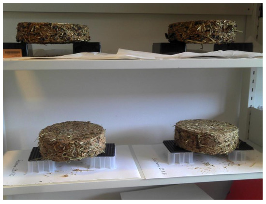 The MB were prepared as described by Molina-Alcaide et al. [23]. Briefly, the procedure consisted of mixing thoroughly all feedstuffs and other ingredients before packing the resultant mixture into round metal molds of 30 cm diameter. Molasses, urea, calcium carbonate, sepiolite, salt and the vitamin-mineral mixture were initially mixed with water, and then the rest of the feedstuffs were added. The mixture was heavily packed within the molds and then it was removed from the molds. The compacted MB were stored in a dark ventilated temperature-controlled room at 20 °C until performing the analyses (Figure 1). Once a week, the MB were turned to accelerate the drying process.