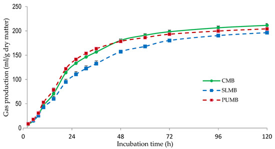 Ruminal parameters determined after 24 h of incubation for all MB are shown in Table 5. The greater pH (p < 0.05) of SLMB compared with CMB is consistent with the lower IVDMD observed for SLMB (Table 4), as these parameters are negatively related. However, no differences (p = 0.445) among MB were observed in total VFA production. Gas production is strongly correlated with total VFA production [54], and gas production was similar for all MB over the first 15 h of incubation. After 24 h, SLMB produced less gas than CMB and PUMB (Figure 3), and therefore differences in total VFA production would be expected. However, protein degradation leads to less short chained fatty acids production compared with carbohydrates, and its production is dependent upon amino acid composition and the extent of its ruminal deamination [54]. Different rates of protein degradation, as well as differences in the amino acid profile of the MB, could help to explain these results.