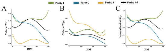 The curves of phenotypic and genetic parameters of SCS within lactations of different parities. (A) The change in genetic variance component estimates of traits during lactation. (B) The change in permanent environmental effect variance component estimates of traits during lactation. (C) The change in heritability estimates of traits during lactation (green, blue, orange, and black lines represent the first parity, second parity, third parity, and first three parities, respectively). DIM: days in milk.