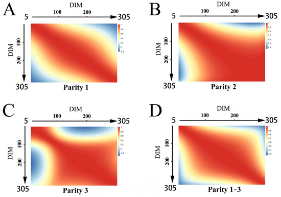 The permanent environmental correlations of the SCC with different DIM stages during lactation are displayed in Figure S2. The permanent environmental correlation between any two DIM stages during lactation was above 0.5 for parities 1 and 1–3 (Figure S2A,D). However, for parity 2 and parity 3, the permanent environmental correlations in the early lactation period and late lactation period were relatively low (<0.3, Figure S2B,C).