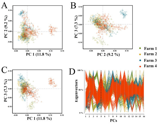 The individuals in this study were divided into several groups of varying size, as seen in Figure 3. The population stratification level was calculated using the top three principal components (PCs). The three greatest PCs, which accounted for 11.8%, 9.2%, and 7.3% of the variance, respectively, explained 28.3% of the variation when combined (Figure 3A–C), but only the first two principal components played significant roles (p < 0.05) in population stratification (Table 2). After the fifth principal component, each of the following principal components could separate the population effectively, and the top five PCs were therefore included as covariates in the fixed effects model for the association analysis (GWAS) to prevent false positives caused by group stratification (Figure 3D).