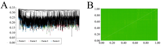We also used a population cluster analysis and an IBS analysis based on the genotype data for all the individuals. The results showed the cattle population’s genetic structure and estimated the ancestry proportions to assign individuals to clusters of four farms. The farms were shown to have a large number of clusters, although the clusters were very close to each other in the observed data (Figure 4A). The results of the IBS analysis also showed a relatively similar genetic background among the individuals in the farms (Figure 4B).