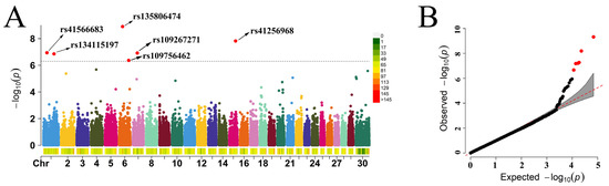 Manhattan plots (A) and quantile–quantile (QQ) plots (B) generated from association analysis result. Significant mutations are represented by red dots. Chromosomes and negative logarithms of the p-values for the variations are represented by abscissas and ordinates in the Manhattan plots, respectively (A). Negative logarithms of the anticipated p-values and the identified p-values of variations are represented by the abscissa and ordinate of the QQ plot, respectively (B).