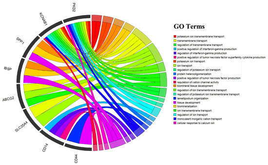 In total, 162 GO terms were significantly enriched (Table S3). The genes that were only enriched in one GO term were eliminated, and eight genes enriched in 22 GO terms were maintained (Figure 6). The majority of these took part in transmembrane transport, tissue development, and inflammatory factor regulation, as well as cellular responses, such as potassium ion transmembrane transport, transmembrane transport, the regulation of transmembrane transport, the regulation of interferon gamma production, the positive regulation of tumor necrosis factor superfamily cytokine production, the regulation of potassium ion transport, protein hetero-oligomerization, the positive regulation of tumor necrosis factor production, the regulation of cation channel activity, biomineral tissue development, lamellipodium organization, tissue development, and cellular responses to calcium ions. Eight of the thirty-two genes were identified in the aforementioned 22 biological processes (Figure 6).
