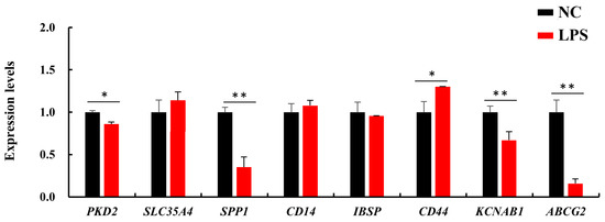 The relative expressions of potential candidate genes were validated in LPS-challenged bMECs using the RT-qPCR technique. The results revealed a significant difference between the LPS-treated group and the control group. Interestingly, the expression of PKD2, SLC35A4, SPP1, CD44, KCNAB1, and ABCG2 was significantly upregulated in response to LPS (Figure 7). SPP1, IBSP, and CD44, in particular, were related to the Toll-like receptor signaling pathway cascade. Additionally, CD14 and MAPK10 were related to the MAPK signaling pathway and multiple species of apoptosis, indicating that the Toll-like receptor signaling pathway played a significant part in the development of inflammation by recognizing molecular patterns linked with pathogens and triggering innate immune responses. The MAPK pathway has also been involved in the development of inflammation in bovine-related studies [61,62], and so we believe these genes and pathways may perform important regulatory functions in the occurrence of dairy cow mastitis.